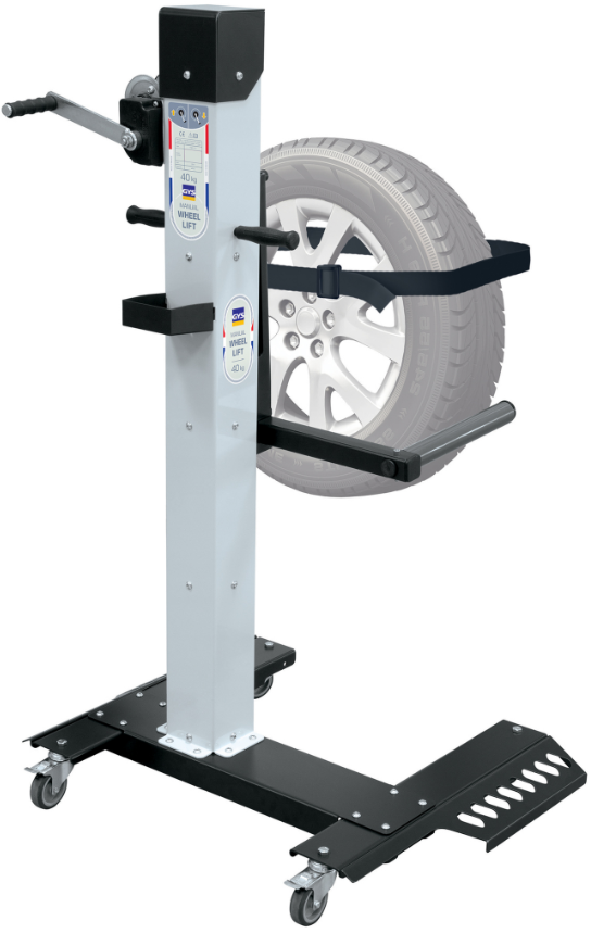 Manual Wheel Lift to ręcznie obsługiwany wózek do podnoszenia i transportu koła pojazdu. Zaprojektowany z myślą o ergonomii pracy i redukcji obciążeń fizycznych w warsztatach. Pozwala jednej osobie bez większego wysiłku wkładać wyjęte koło na felgę i transportować je na stanowisko robocze. Dzięki korbie z hamulcem zabezpieczającym kolo pozostaje stabilnie na miejscu podczas pracy.